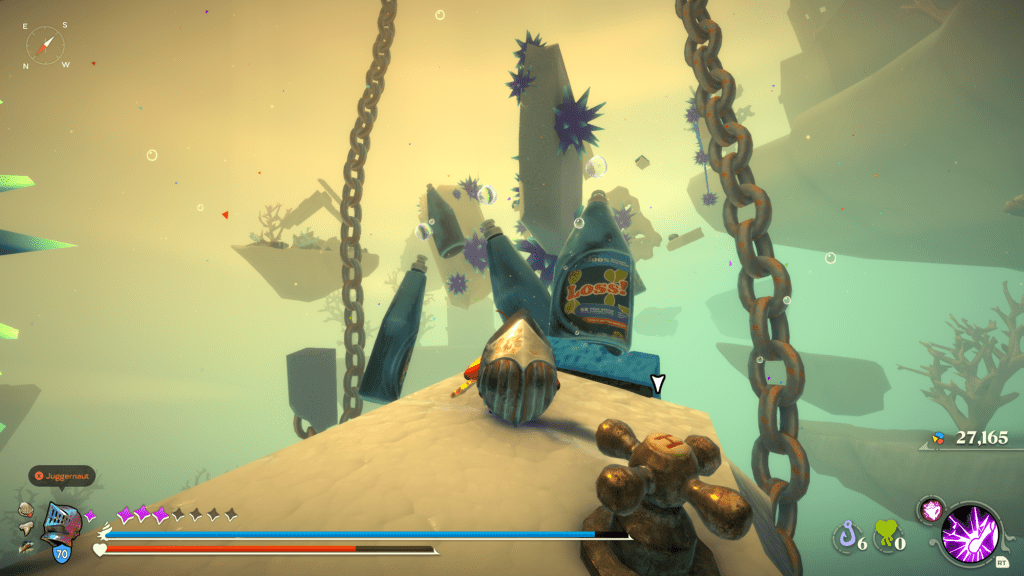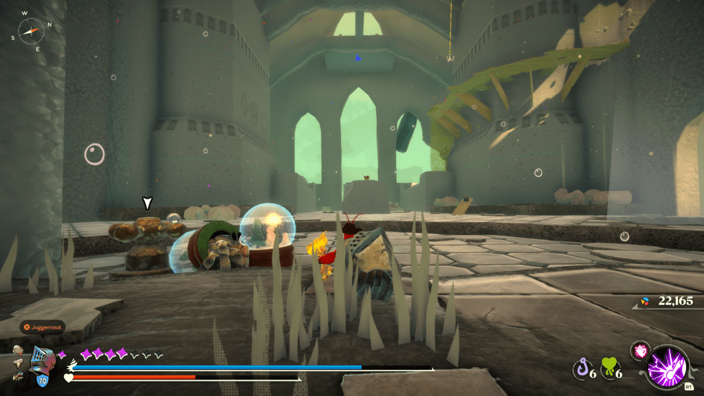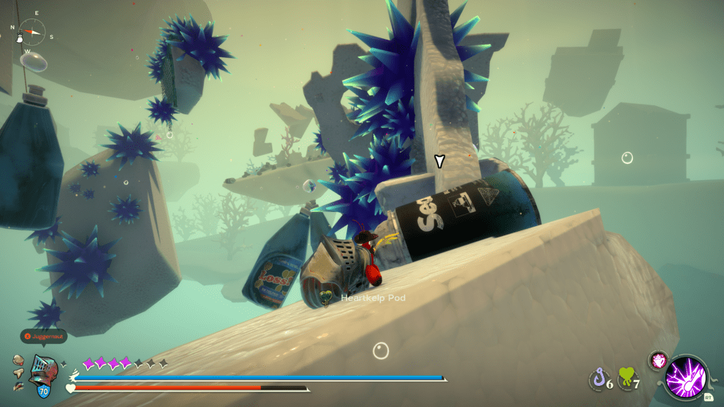 According to the description for the achievement “Shellslike” in Another Crab’s Treasure, we must find a certain hero’s helmet. This is easier said than done though, as I believe this to be the hardest shell to get in the game. This can be found in the final area of the game, the Old Ocean. Once in the Old Ocean you will need to reach the moon snail shell at the Lookout Tower and then continue through the area until you reach an elevator that takes you to a room with two hermit crabs that are wearing snow globes.